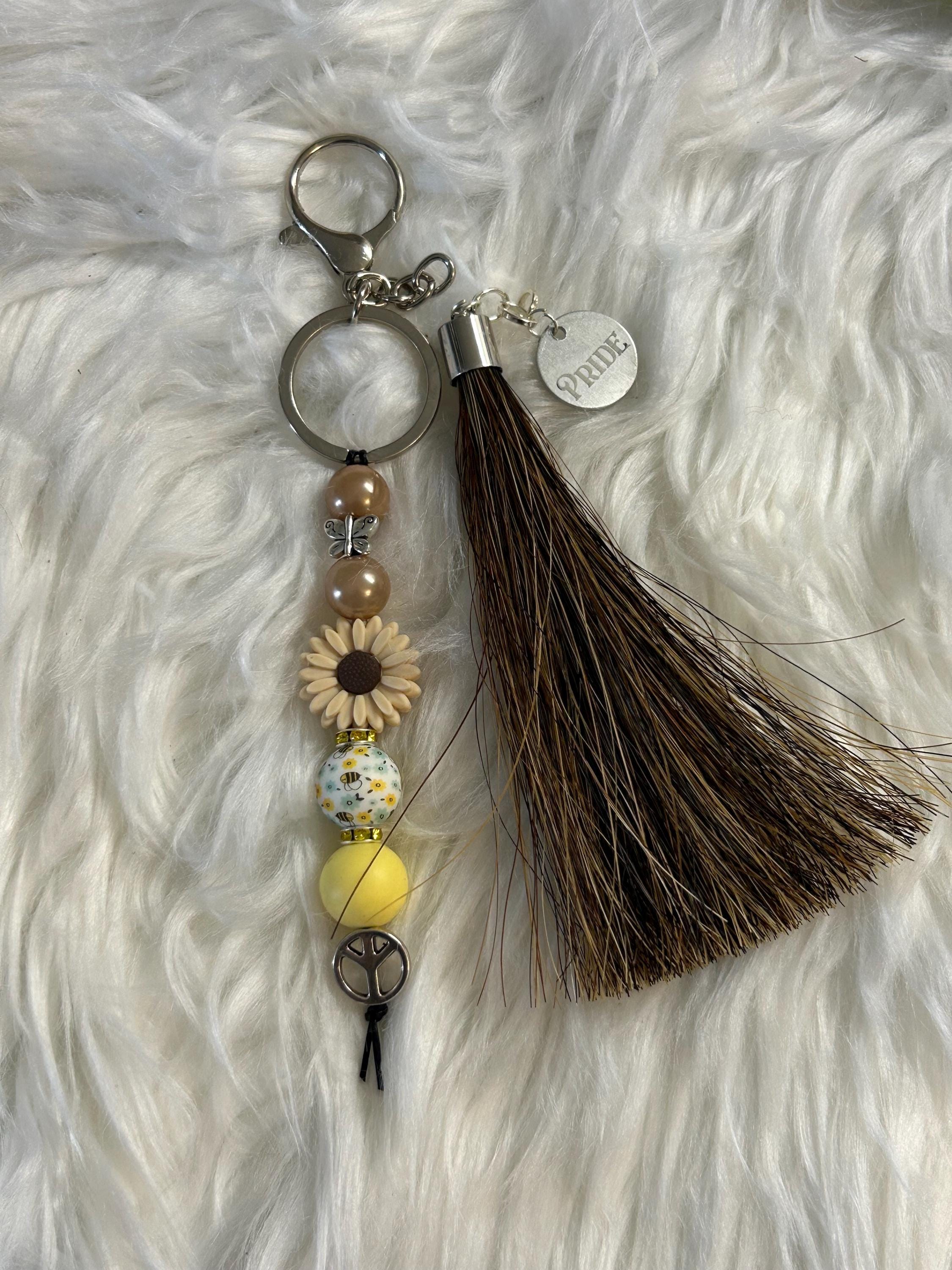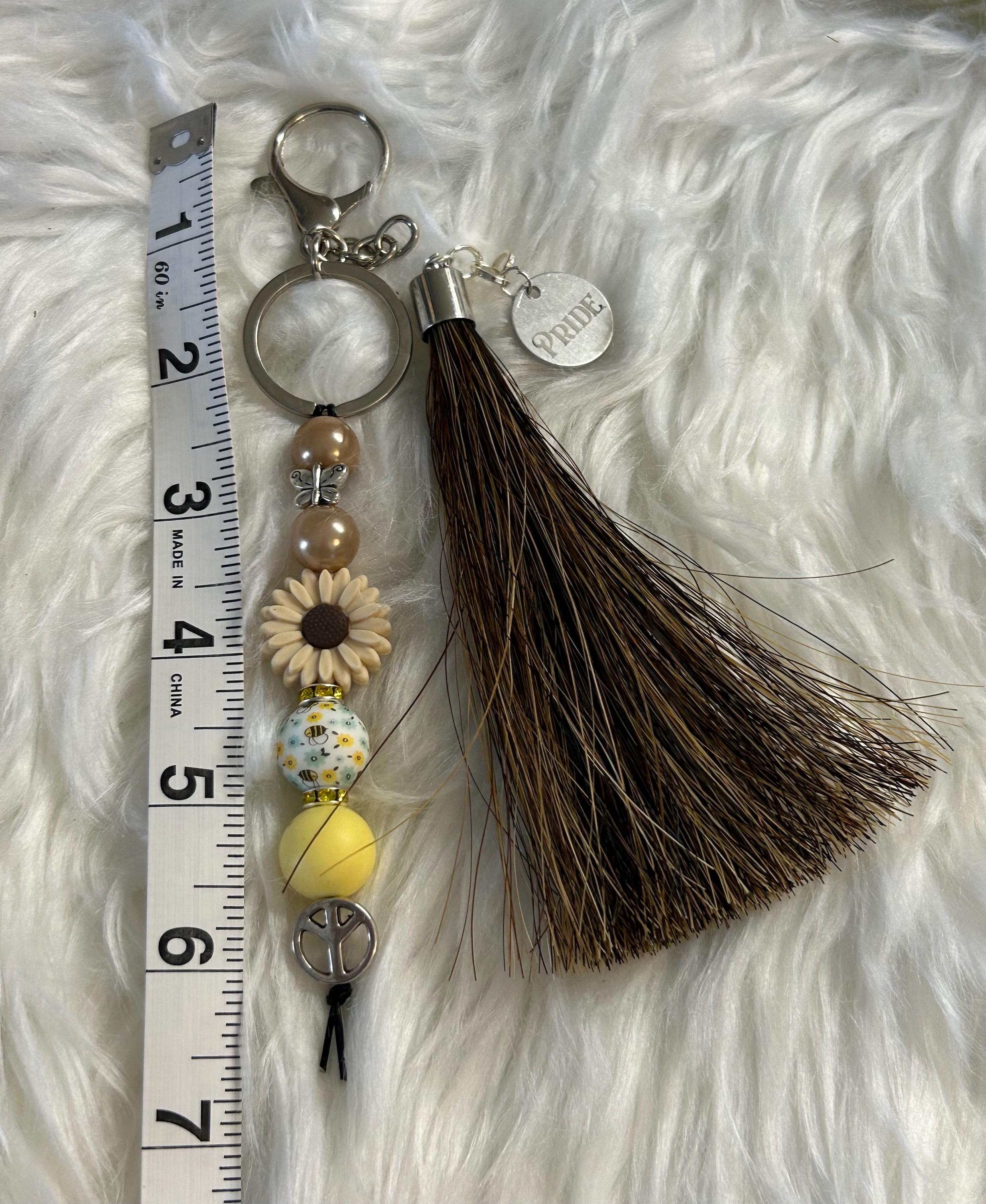 Personalized horse hair key chain/purse charm. This key chain/purse charm is custom made from horse hair you send to me. It is approximately five inches long. The personalized charm is 1/2 inches and engraved with a name of your choice.